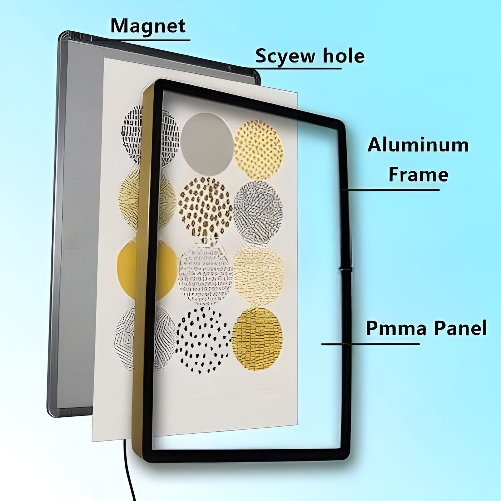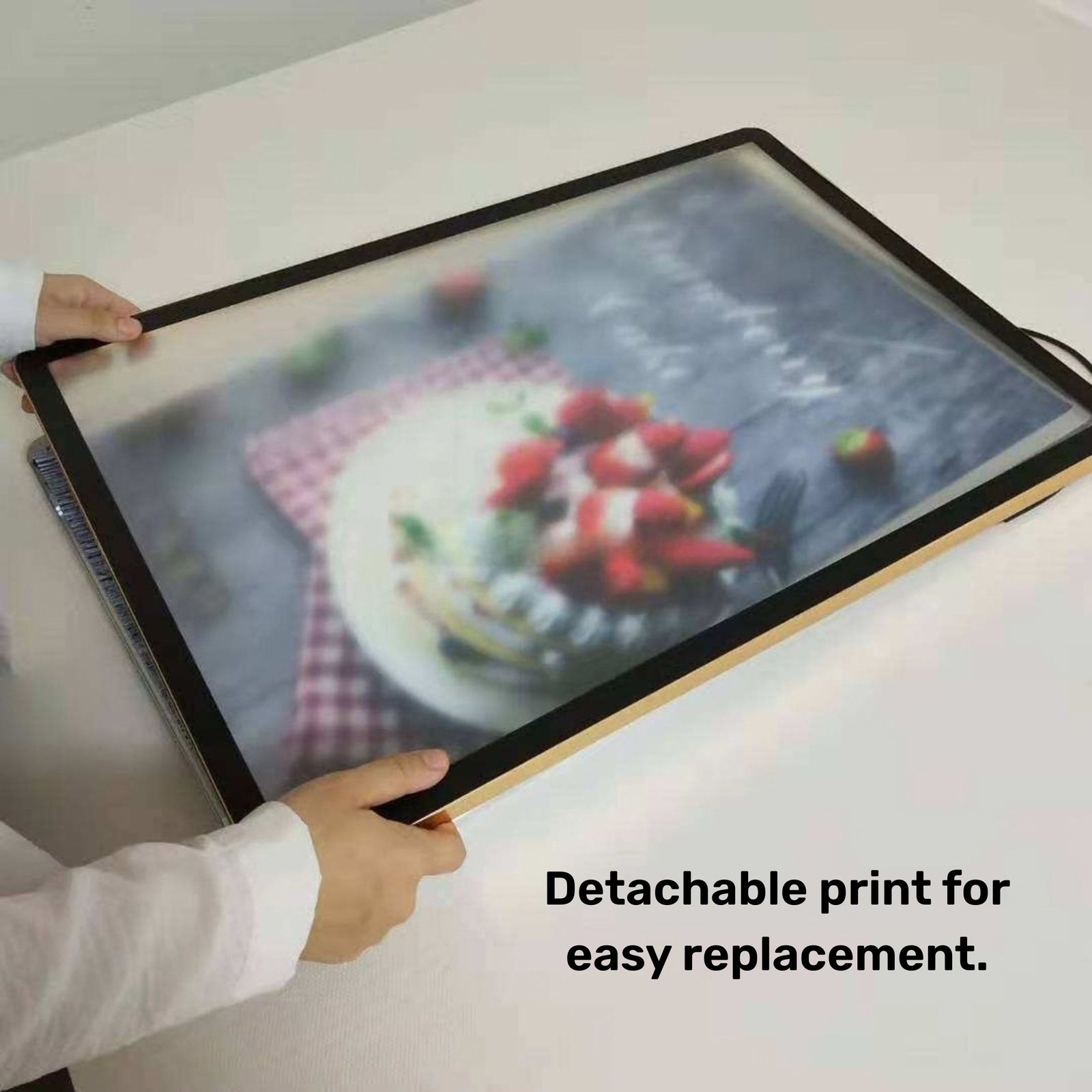 Designed for convenience, this LED lightbox frame allows quick and tool-free content replacement, making it easy for caterers to change food items, counter names, or menu titles during live events.
