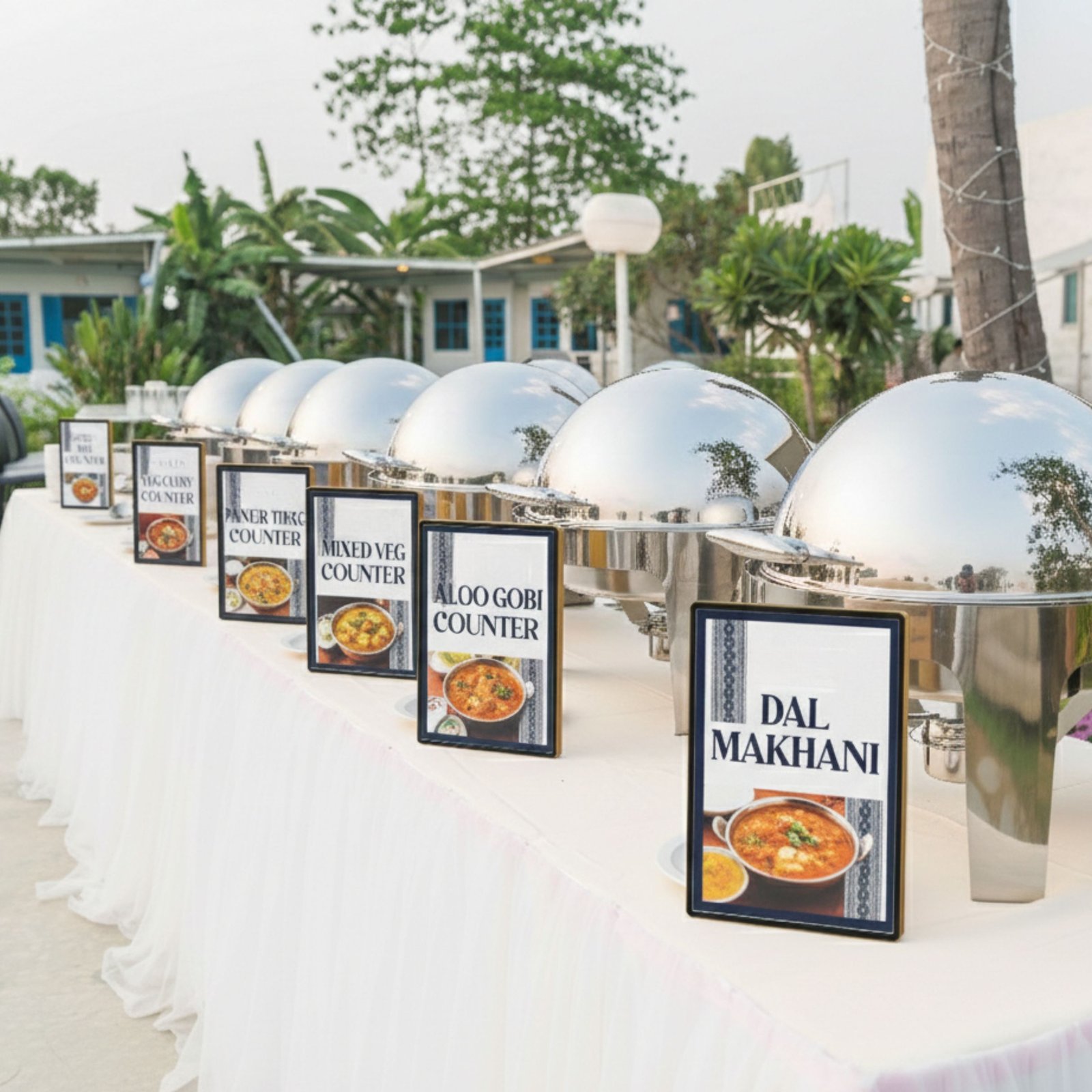 The golden border frame gives a luxurious and professional look, ideal for buffet counters, catering setups, wedding food stations, and hotel displays. It adds elegance while maintaining a clean and organized presentation.